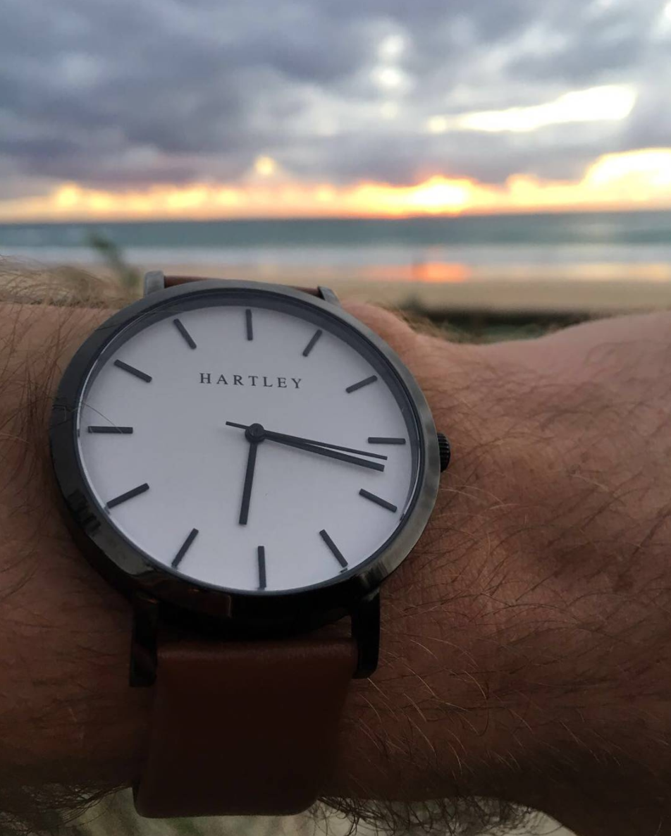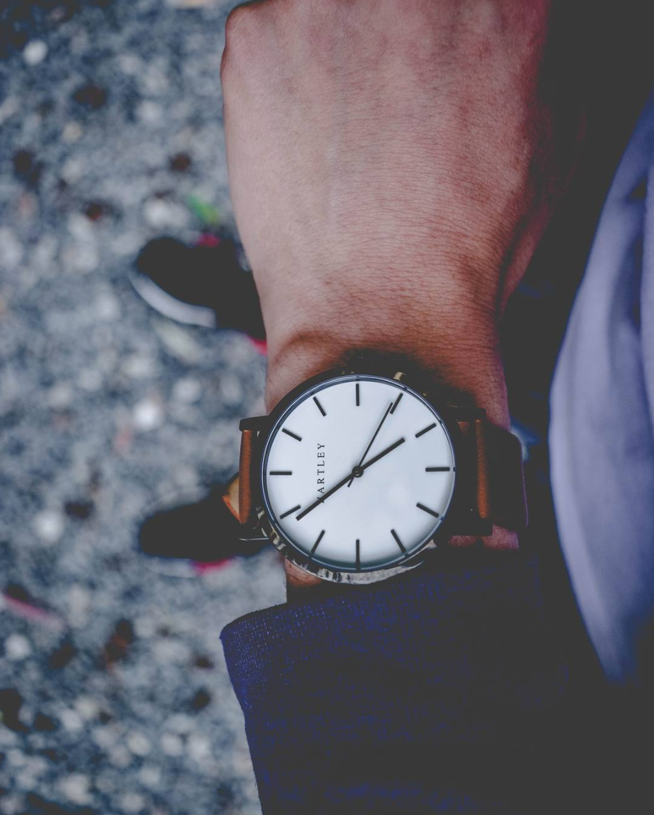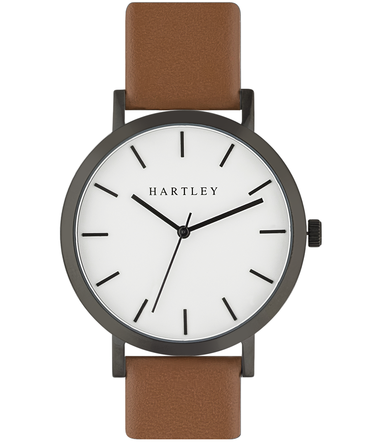 A simple yet sophisticated timepiece featuring a polished black dial on a clean white face with fitting brown bands. Casual or formal, this timepiece suits every occasion.