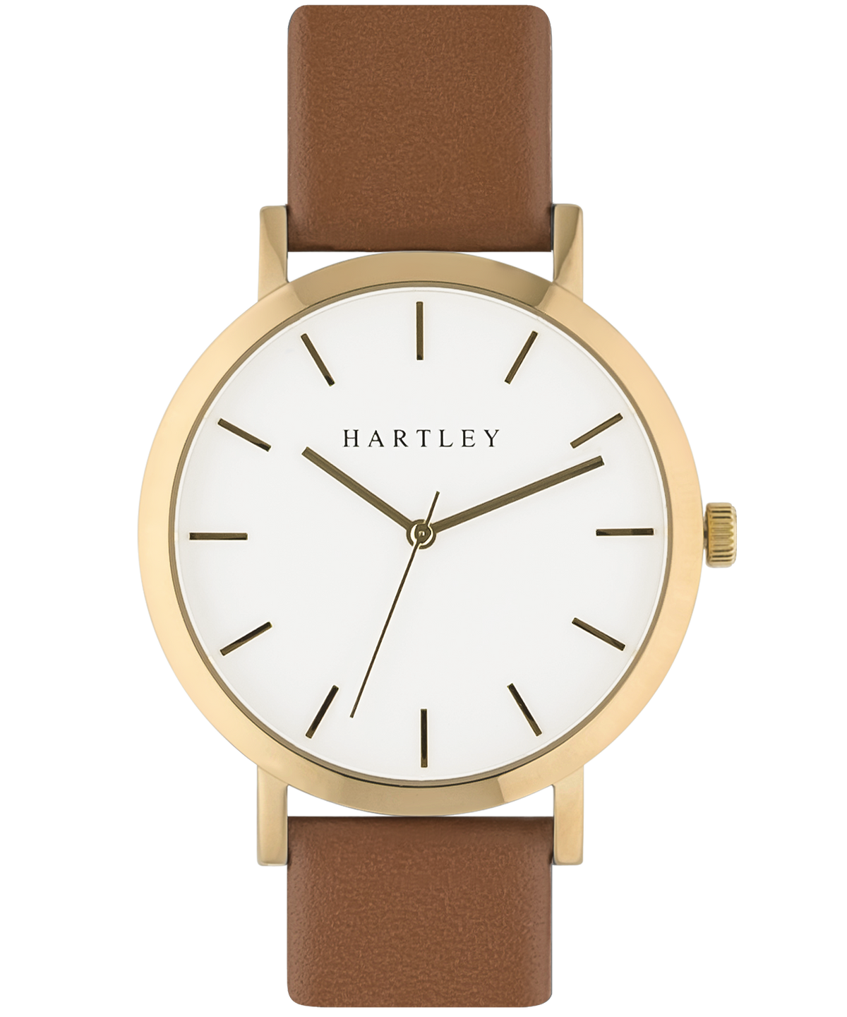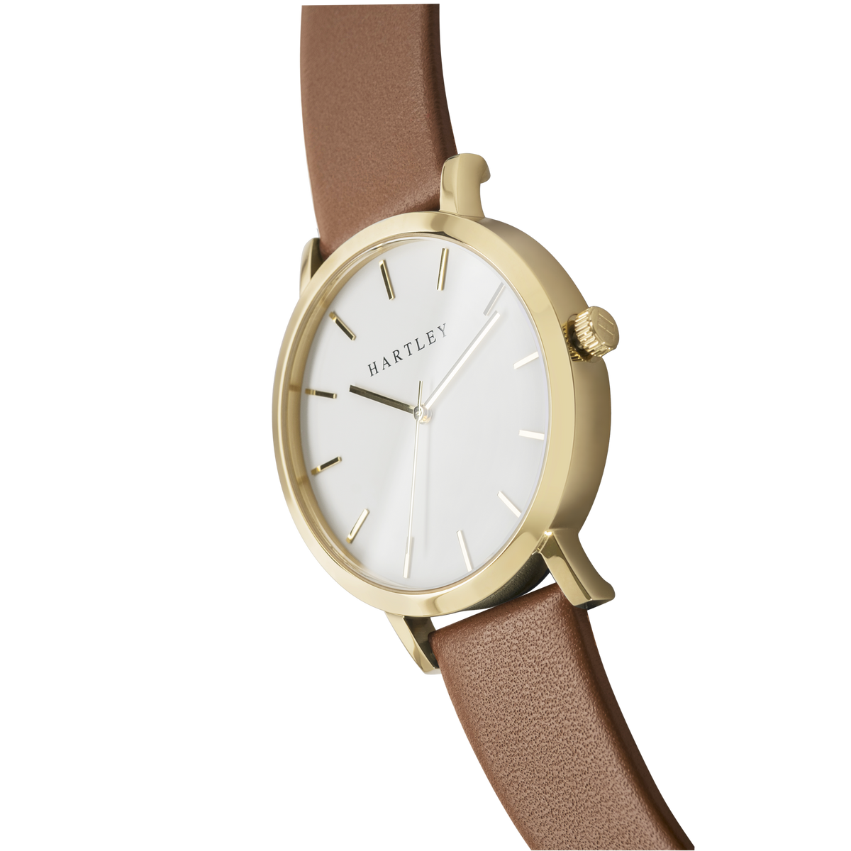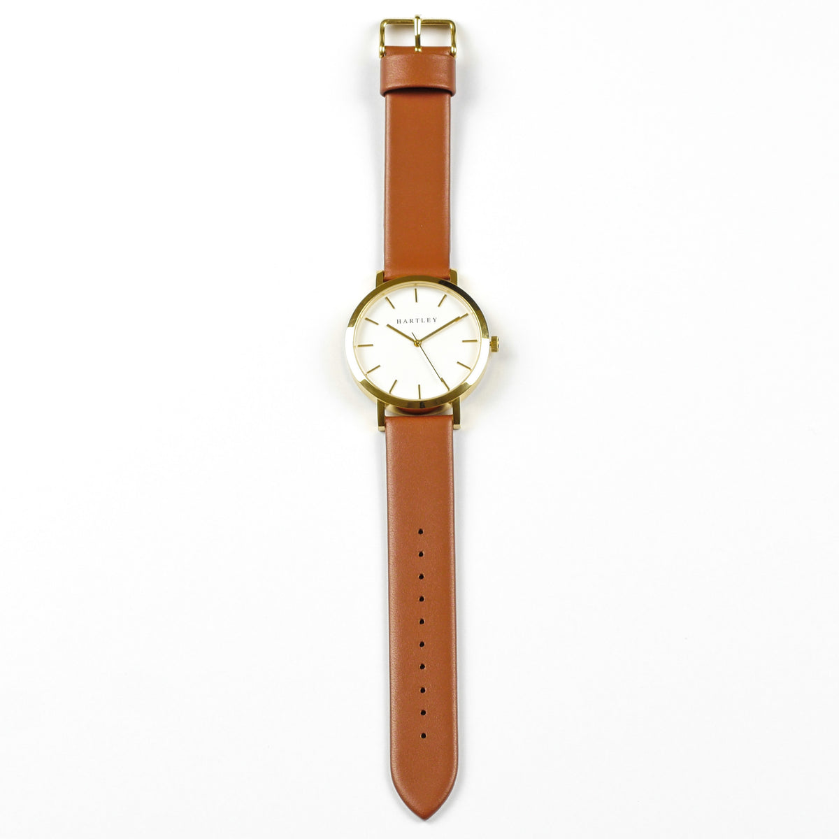 A simple yet sophisticated timepiece featuring polished gold dials and hands on a clean white face with deep brown bands. Casual or formal, this timepiece suits every occasion.