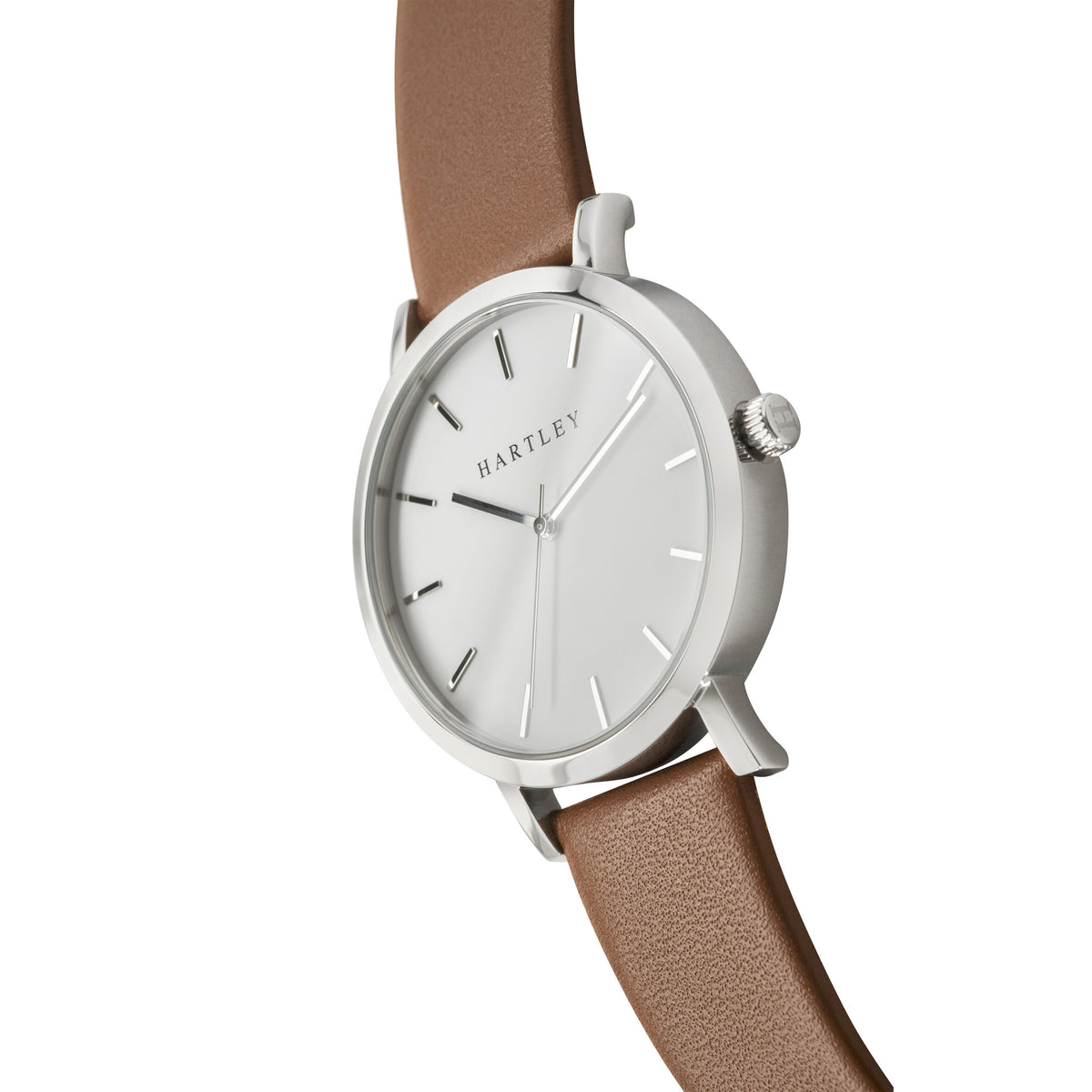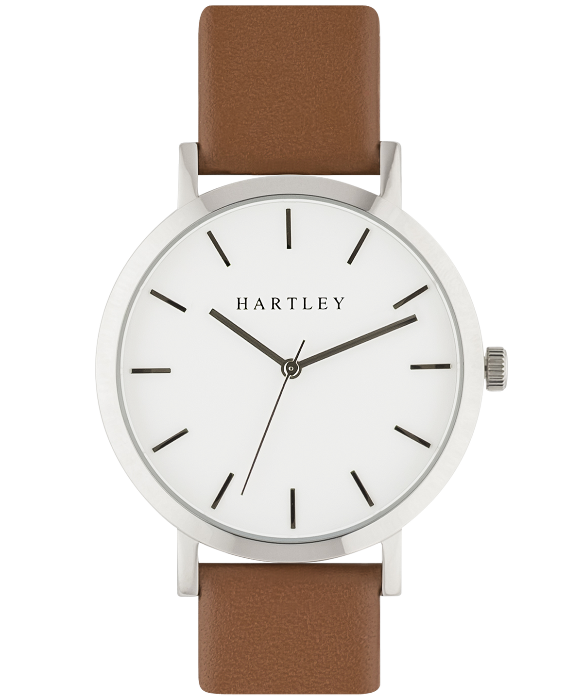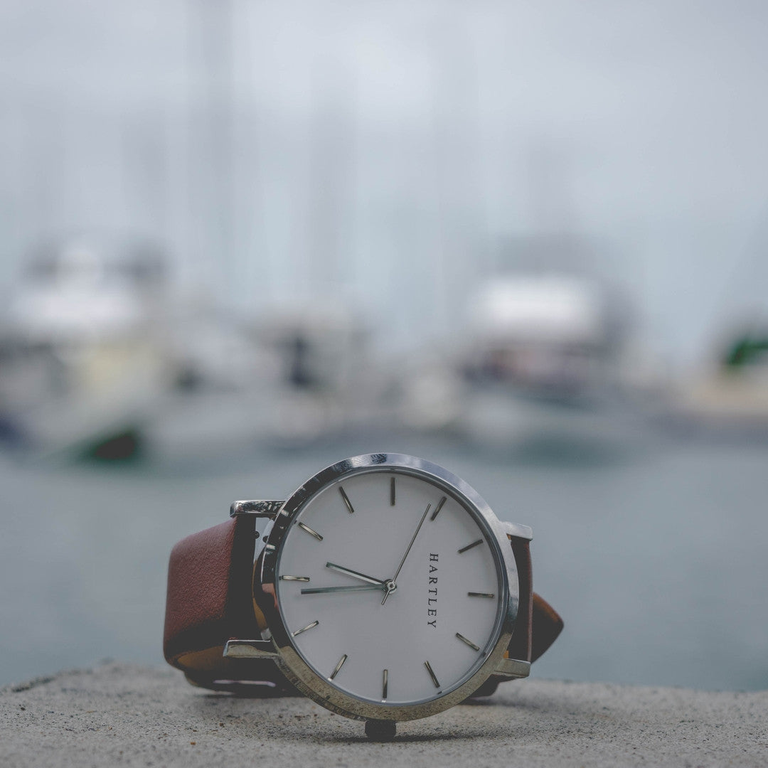 A truly minimalistic brown & silver timepiece featuring polished silver dials and hands on a clean white face. Casual or formal, this timepiece suits every occasion.