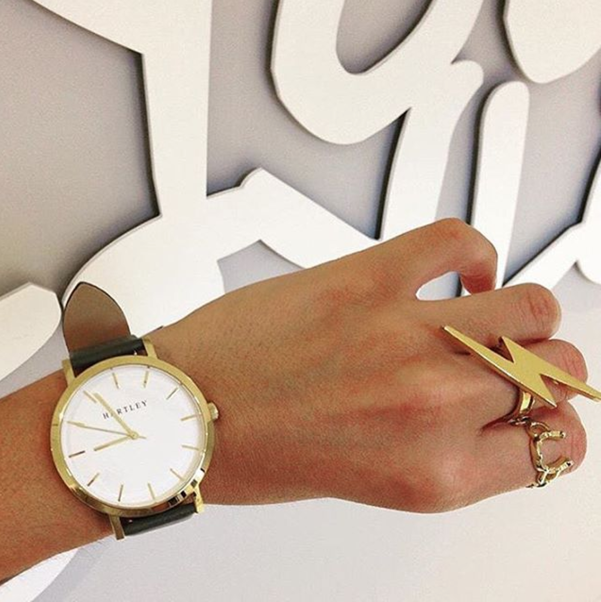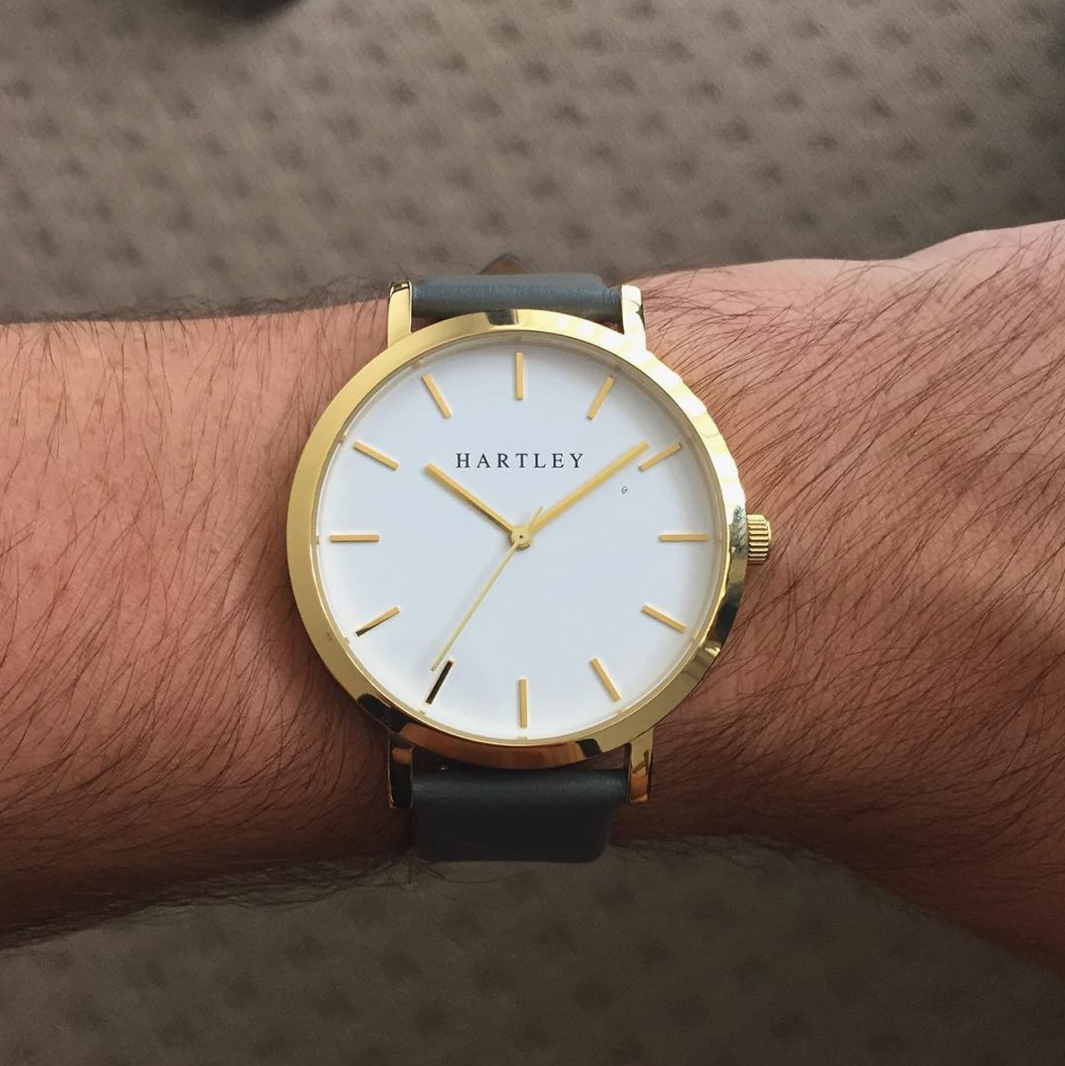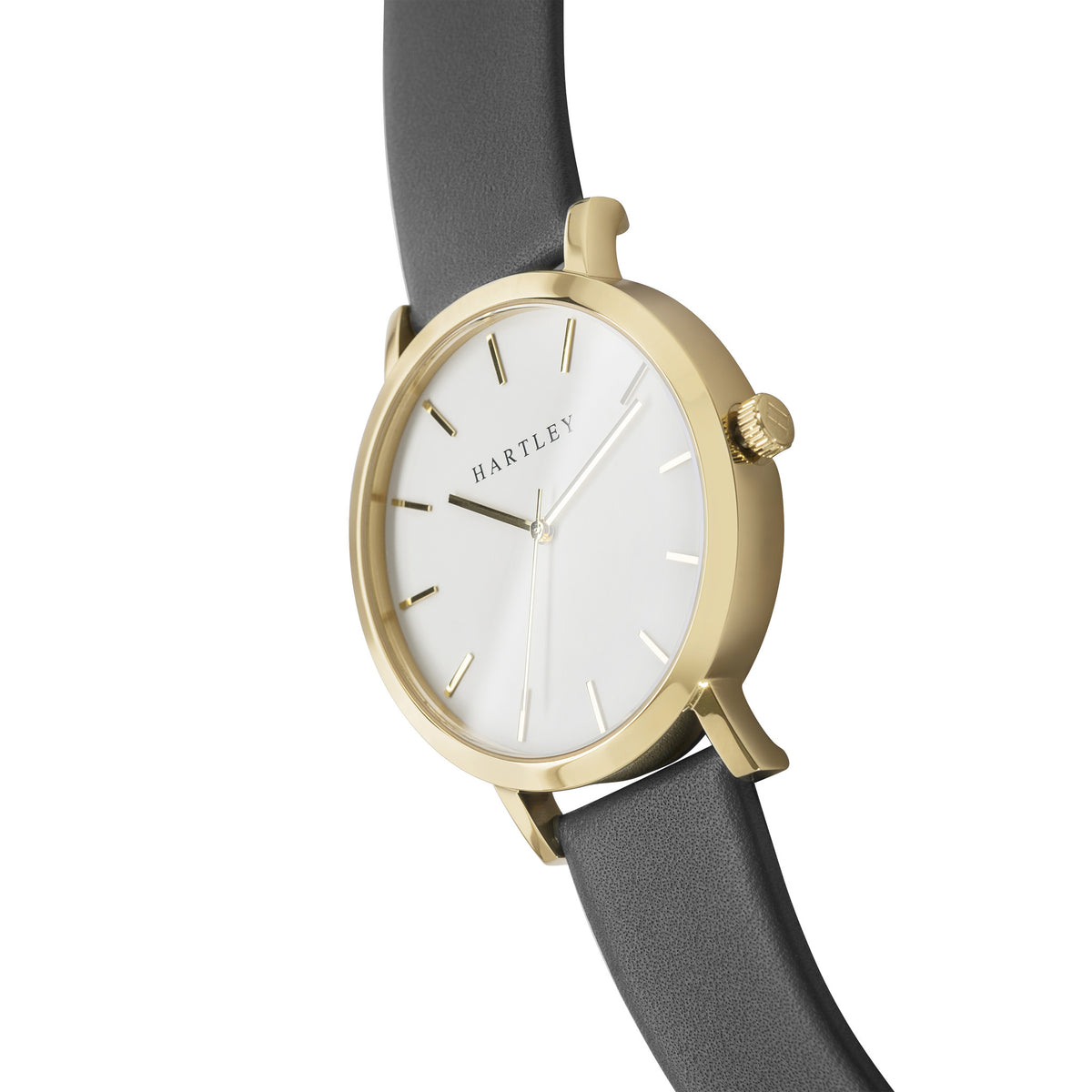 A simple & effective timepiece featuring polished gold dials and hands on a clean white face and striking grey leather band. Casual or formal, this timepiece suits every occasion.