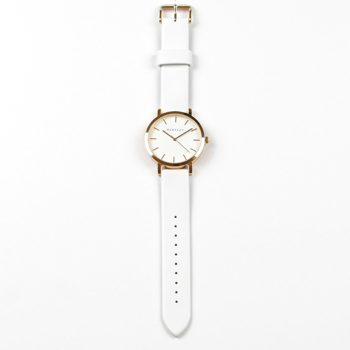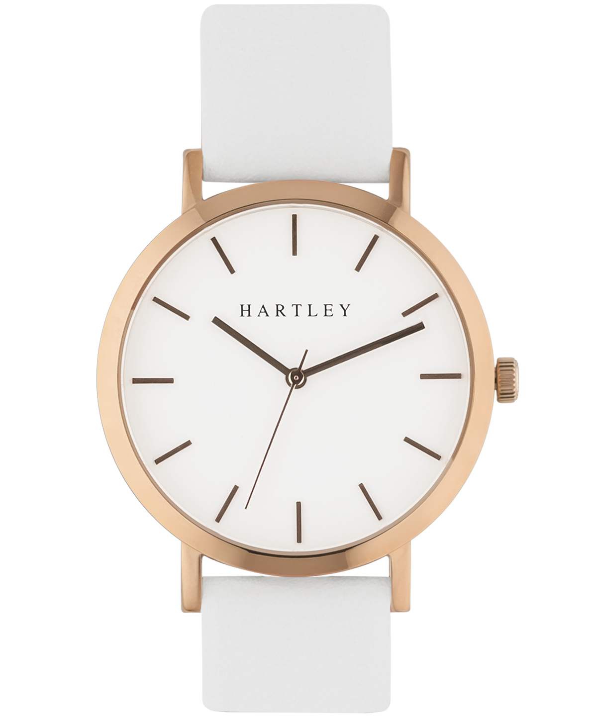 A beautiful timepiece featuring a polished rose gold dial on a clean white face with gorgeous white bands. Casual or formal, this timepiece suits every occasion.