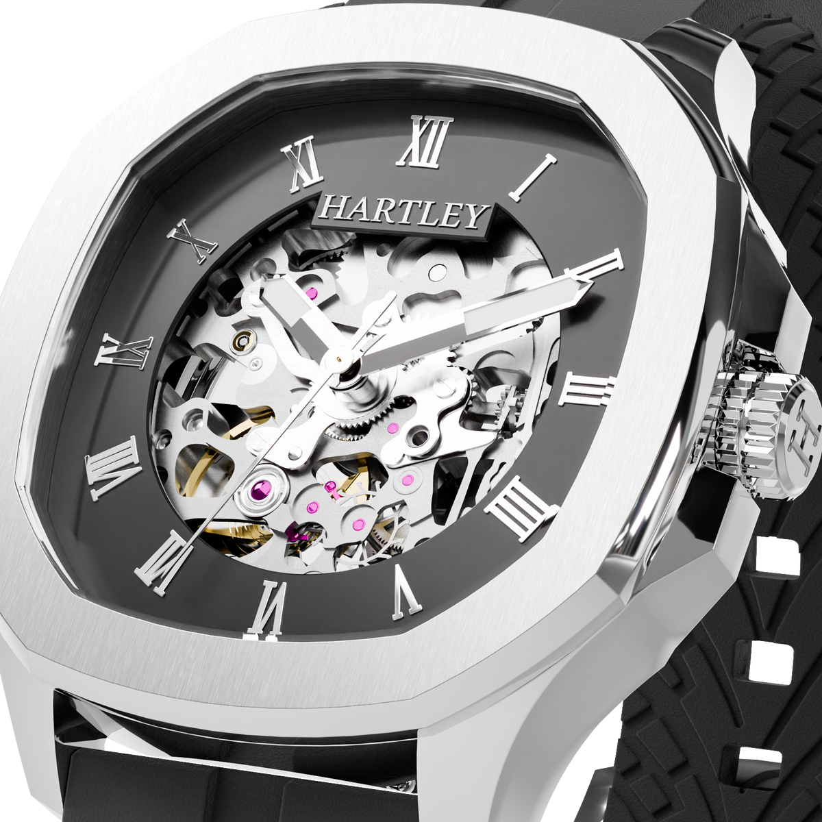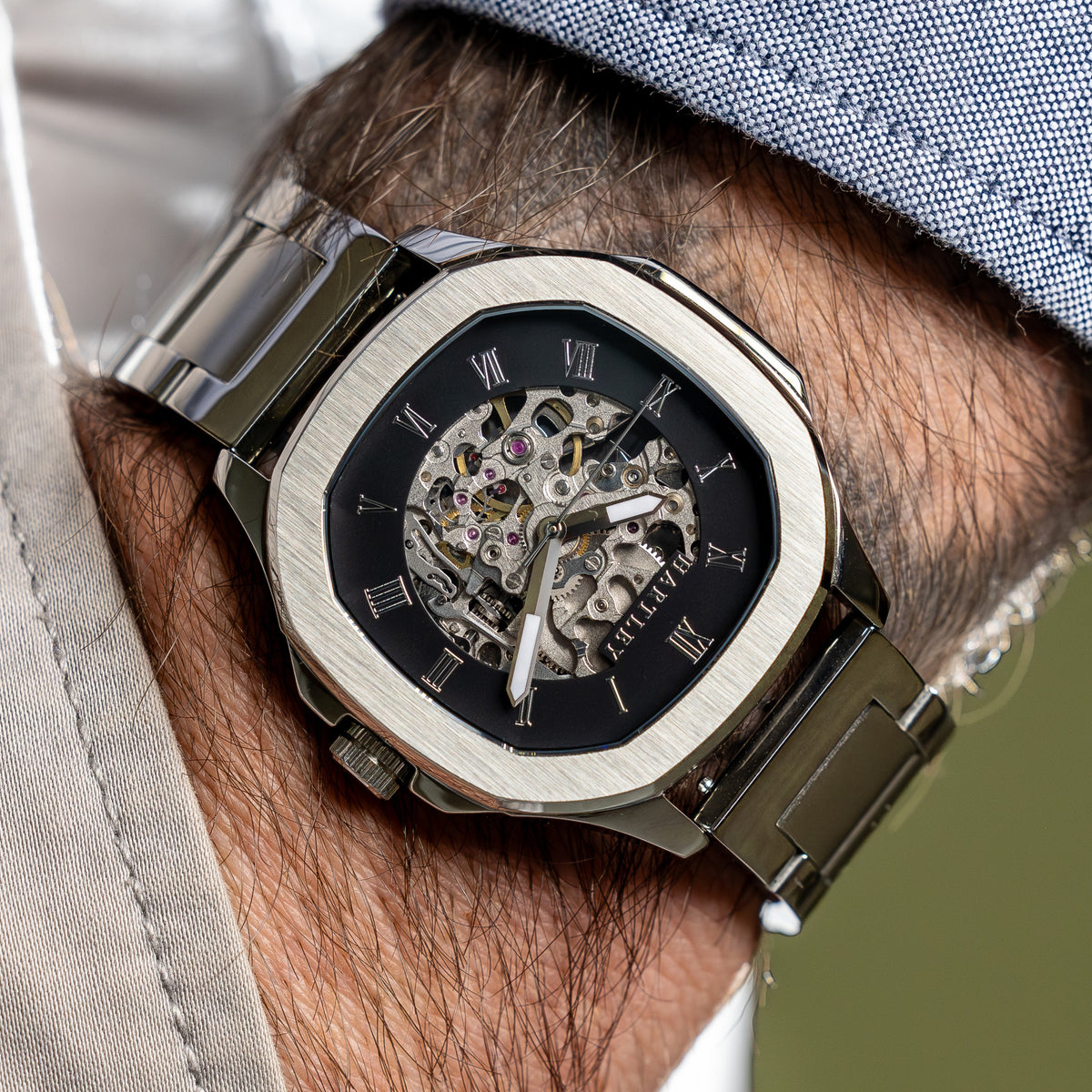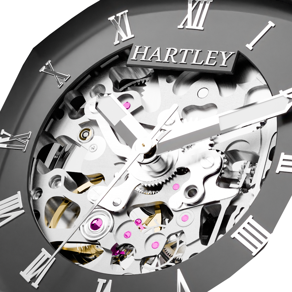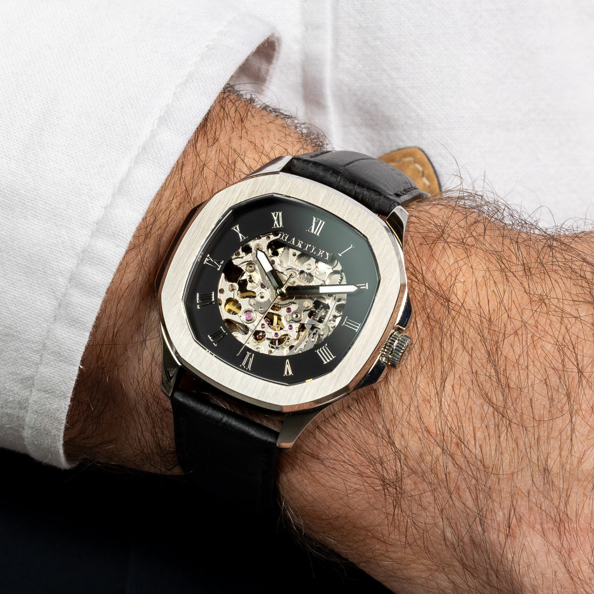 This stunning watch is intricately designed to showcase its mesmerizing automatic mechanical movement. With its refined black case and black crocodile embossed Italian leather strap featuring a butterfly clasp, it adds a touch of class to any sophisticated occasion.